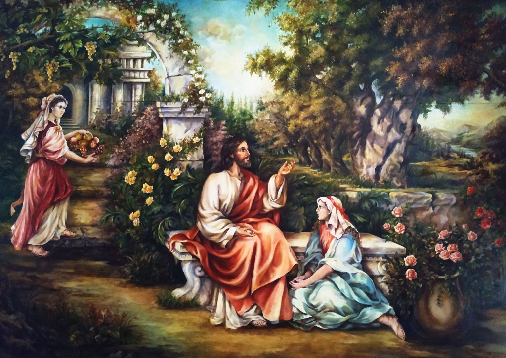 Jesús con Marta y María, pintura de Sor Natividad Dávoli, Monja Mínima de Daimiel