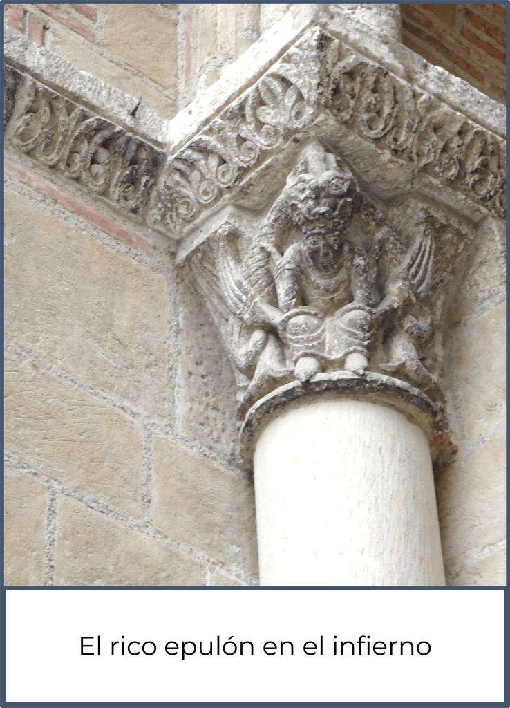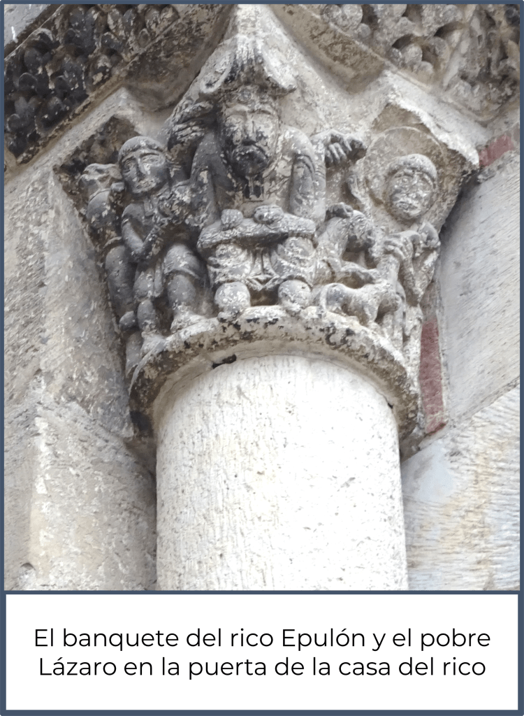 En una de las puertas románicas de la basílica de san Sernin de Toulouse, en Francia, está representada la escena evangélica del rico y el pobre Lázaro. No es el único caso: también está esculpida en capiteles románicos de otros lugares.